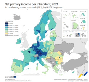 En 2021, había 10 regiones de la UE en el nivel 2 de la nomenclatura de unidades territoriales estadísticas (NUTS 2) con una ratio de renta primaria neta por habitante de al menos 30 000 PPS. 6 de estas 10 regiones estaban situadas en Alemania, mientras que el resto estaban situadas en otras regiones occidentales de la UE.