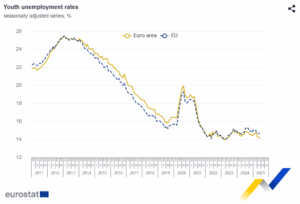 En junio de 2025, 2,857 millones de jóvenes (menores de 25 años) estaban desempleados en la UE, de los cuales 2,241 millones se encontraban en la zona euro. En junio de 2025, la tasa de desempleo juvenil se situó en el 14,7% en la UE , estable respecto a mayo de 2025, y en el 14,1% en la zona euro, inferior al 14,3% del mes anterior.