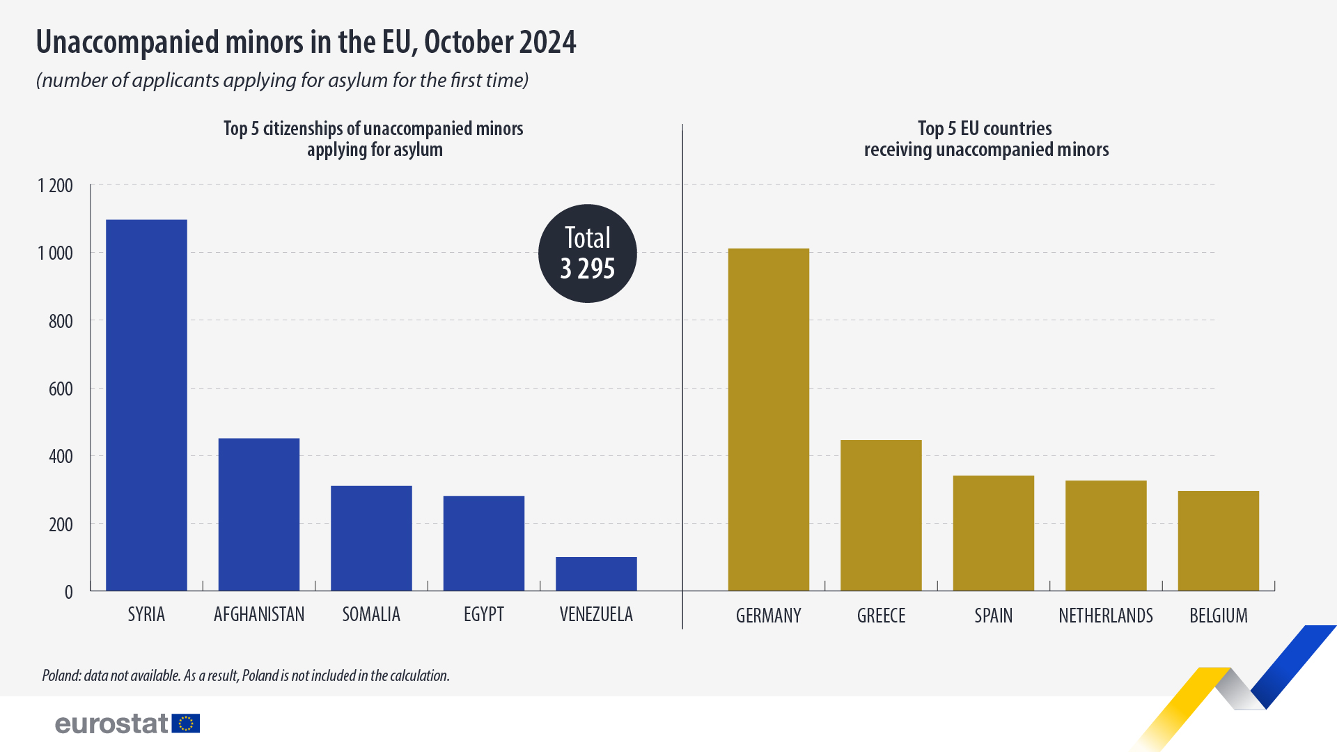 Un total de 3.295 menores no acompañados solicitaron asilo por primera vez en la UE, la mayoría de ellos procedentes de Siria (1.095) y Afganistán (450).