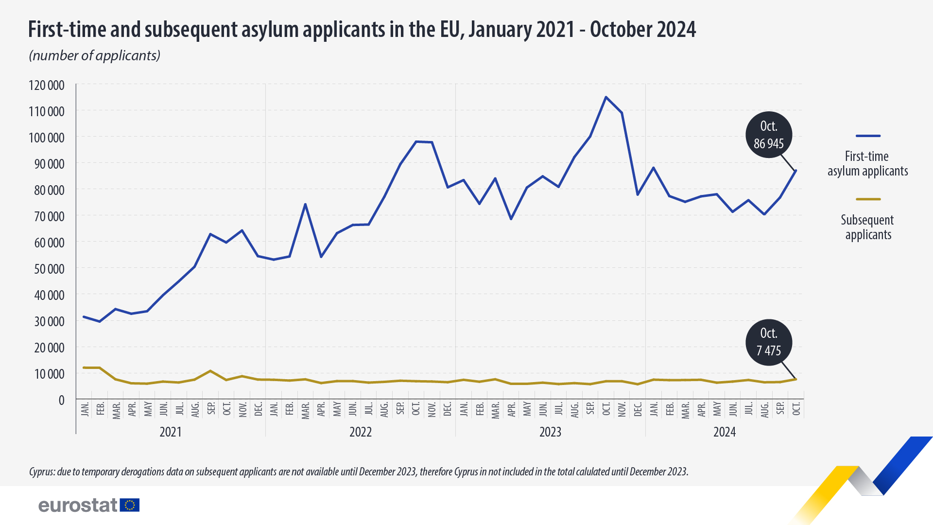Un total de 86.945 personas de países no pertenecientes a la UE solicitaron protección internacional en países de la UE en octubre de 2024, lo que supone una disminución del 24% en comparación con octubre de 2023 (114.890).