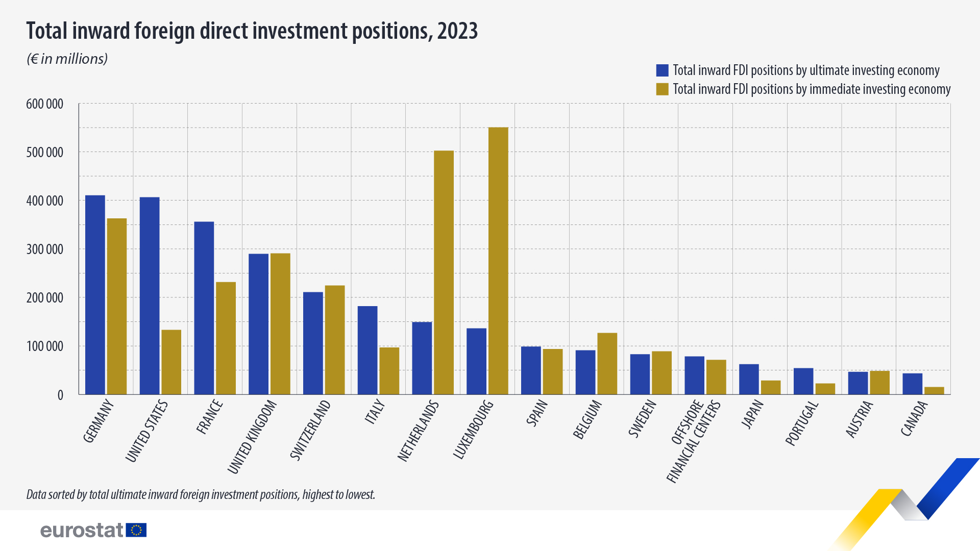 Según Eurostat, Luxemburgo representó la mayor parte de las inversiones totales con 550 billones de euros (16,9% del total por economía inversora inmediata), seguido de los Países Bajos (502 billones de euros; 15,4%), Alemania (363 billones de euros; 11,1%), Reino Unido (291 billones de euros; 8,9%) y Francia (231 billones de euros; 7,1%).