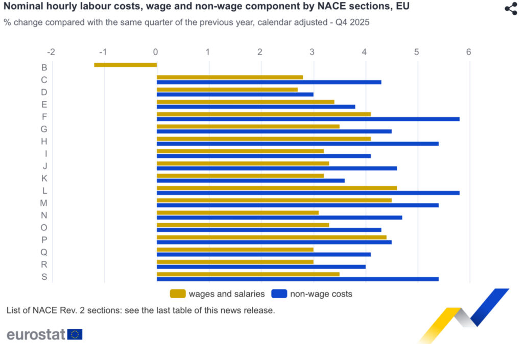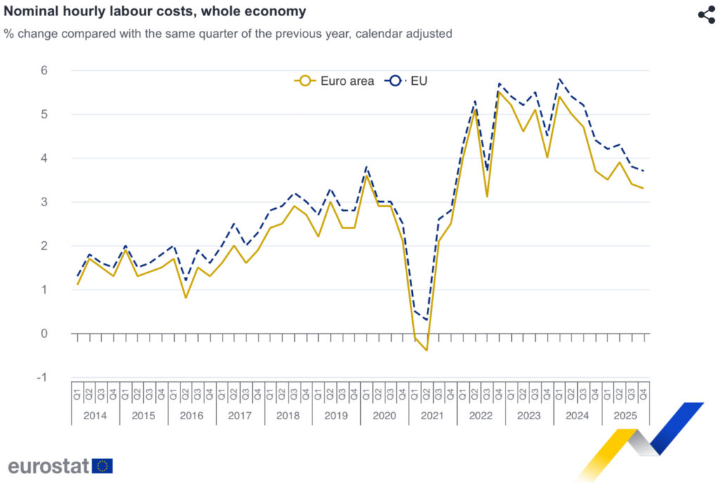 En el cuarto trimestre de 2025, en comparación con el mismo trimestre del año anterior, los costos laborales por hora en la zona del euro aumentaron un 3,5 % en la economía (principalmente) no empresarial y en un 3,2 % en la economía empresarial: