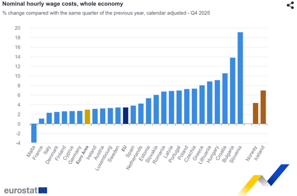 En el cuarto trimestre de 2025, en comparación con el mismo trimestre del año anterior, los mayores aumentos en los costes salariales por hora para toda la economía se registraron en Eslovenia (+19,1 %), Bulgaria (+13,8 %) y Croacia (+10,5 %). Los aumentos más bajos se registraron en Francia (+1,1 %), Italia (+2,3 %), Dinamarca (+2,5 %), Finlandia (+2,6 %), Alemania y Chipre (+2,7 % cada uno), mientras que Malta registró una disminución (-3,9 %).