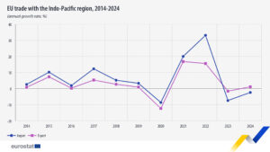 Entre 2014 y 2024, el comercio de la UE con la región del Indo-Pacífico experimentó tasas de crecimiento volátiles tanto en importaciones como en exportaciones. El comercio se contrajo drásticamente durante la pandemia, con una caída de las importaciones del 8,6 % y de las exportaciones del 12,3 % en 2020. A esto le siguió un crecimiento anual récord en 2021 (+20,0 % en importaciones y +16,8 % en exportaciones) y 2022 (+33,1 % en importaciones y +15,6 % en exportaciones). El comercio volvió a disminuir en 2023, pero se ralentizó hasta alcanzar un descenso mínimo en 2024.