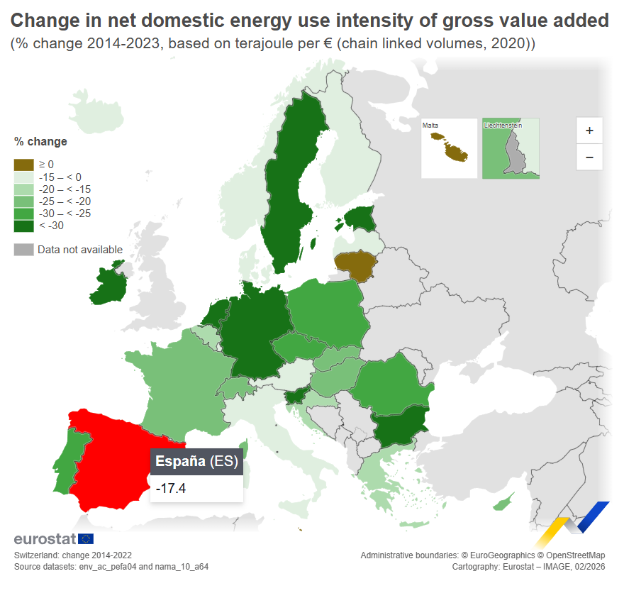 Entre 2014 y 2023, el ritmo hacia una mayor eficiencia energética en las actividades productivas de la UE fue desigual. Estonia (-43,1 %), Irlanda (-42,8 %) y los Países Bajos (-37,2 %) experimentaron las disminuciones más rápidas en la intensidad del uso de energía del valor añadido bruto. Malta (+22,9 %) y Lituania (+9,3 %) fueron los únicos países que observaron un aumento.