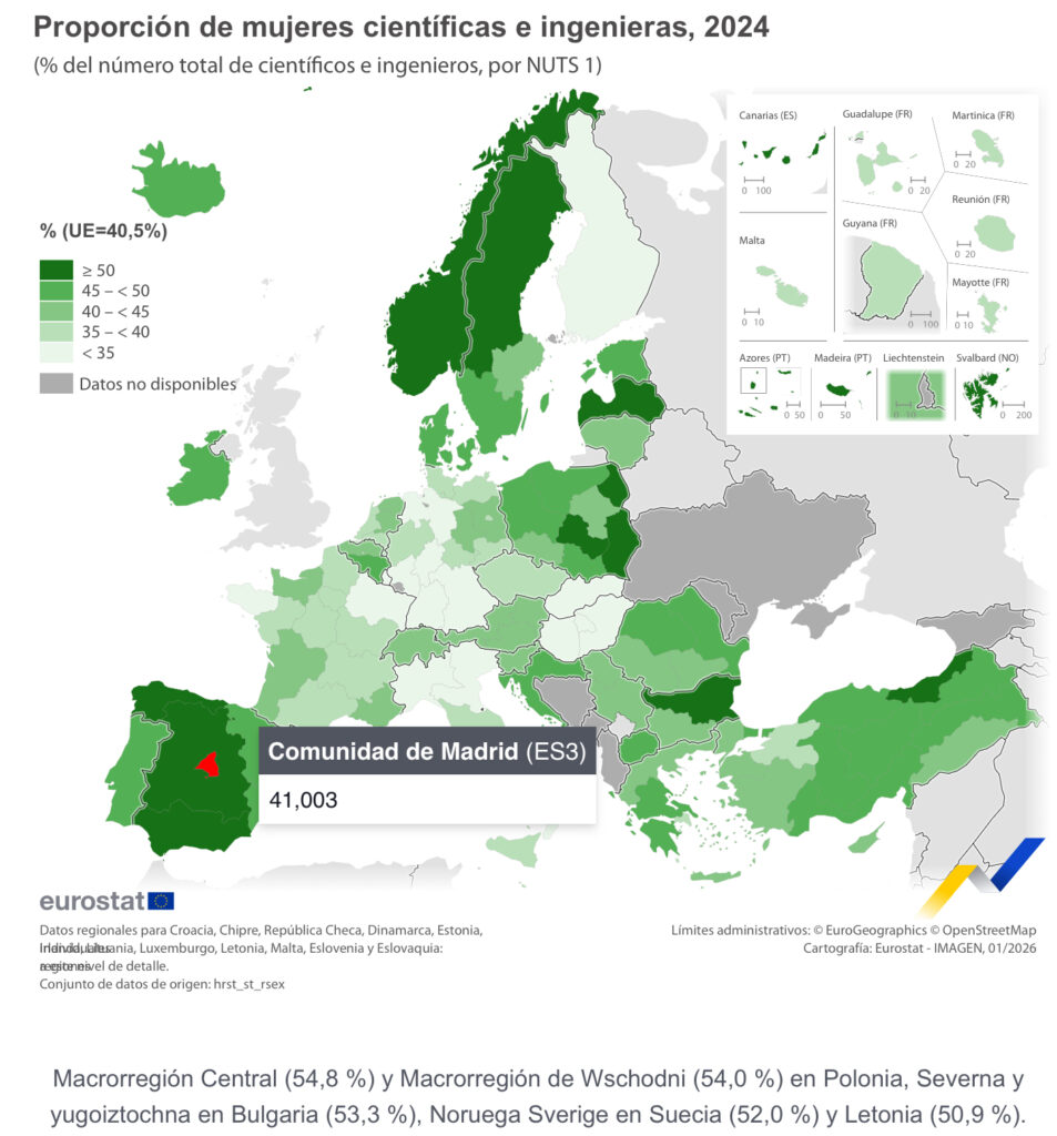 Entre los países de la UE, la proporción de mujeres científicas e ingenieras varió ampliamente en 2024, con los porcentajes más altos registrados en Letonia (50,9 %), Dinamarca (48,8 %), Estonia (47,9 %), España (47,6 %) y Bulgaria e Irlanda (ambos 47,3 %). La representación más baja de mujeres científicas e ingenieras se registró en Finlandia (30,7 %), y luego en Hungría (31,7 %), Luxemburgo (32,4 %), Eslovaquia (33,6 %) y Alemania (34,6 %). Nomenclatura de Unidades Territoriales Estadísticas (NUTS 1), las mujeres científicas e ingenieras fueron mayoritarias en unas regiones de la UE: