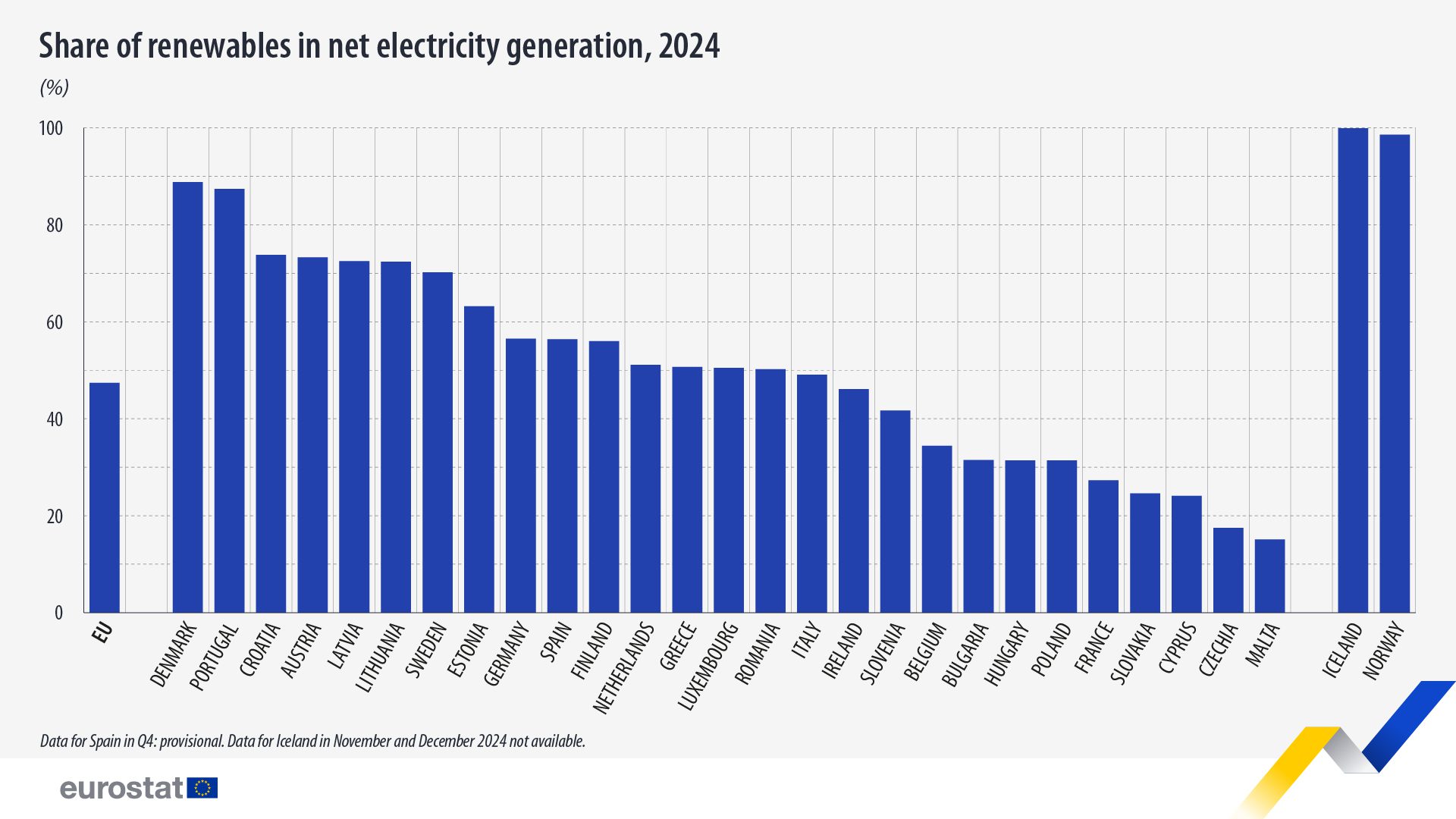 Entre los Estados miembros de la UE, Dinamarca tuvo la mayor proporción de energías renovables en su generación neta de electricidad, con un 88,8%, procedente principalmente de la eólica, seguida de Portugal (87,4%, principalmente eólica e hidroeléctrica) y Croacia (73,8%, principalmente hidroeléctrica).