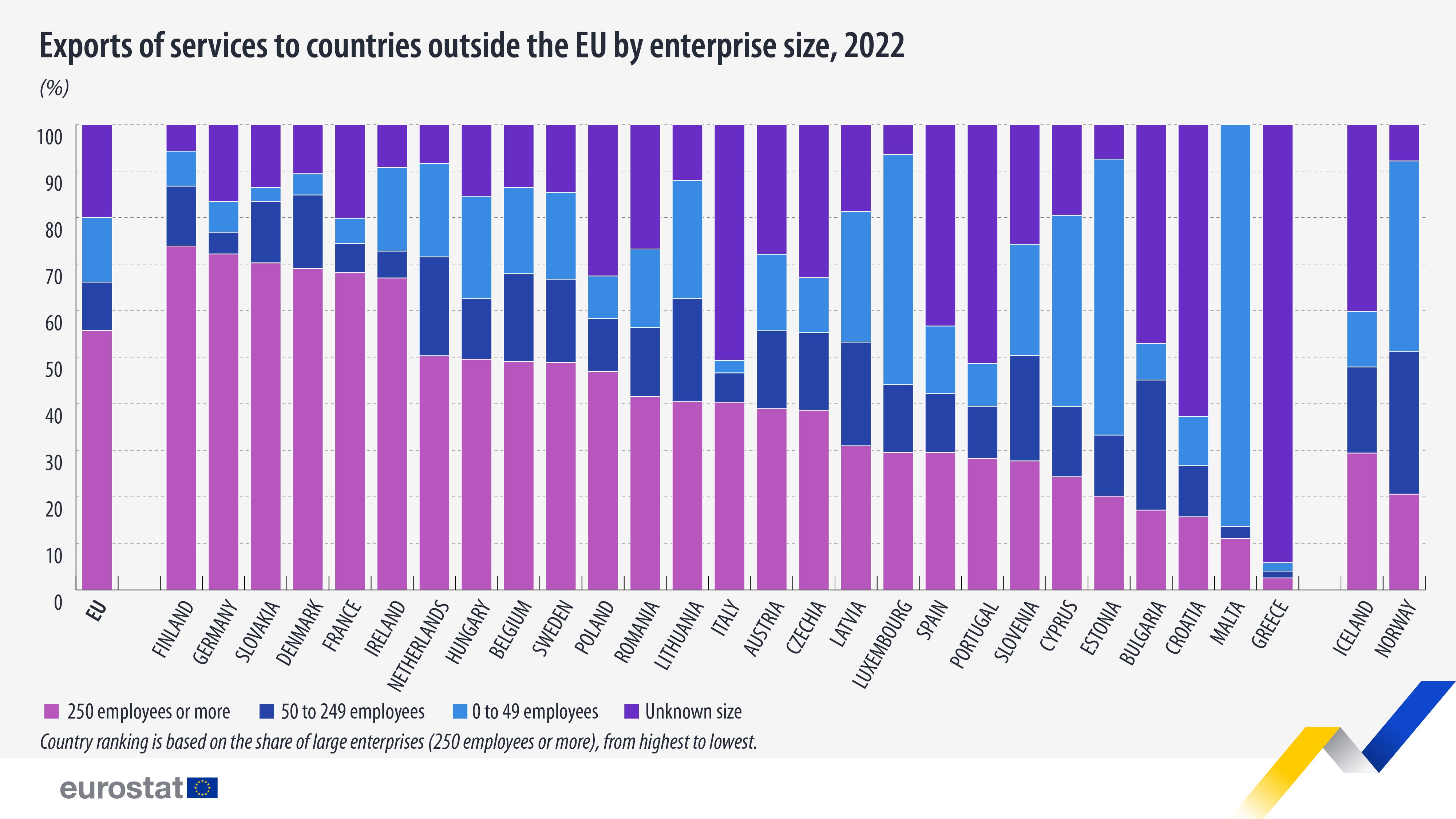 En la mayoría de los países de la UE, las grandes empresas representaron la mayoría de los servicios exportados fuera de la UE, y las mayores contribuciones se registraron en Finlandia (74%), Alemania (72%) y Eslovaquia (70%).
