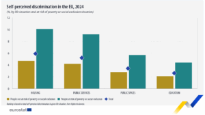 Según datos de Eurostat, las tasas de discriminación autopercibida fueron significativamente más altas entre las personas en riesgo de pobreza o exclusión social (AROPE) en comparación con quienes no enfrentan esta situación, en todos los ámbitos vitales analizados. La mayor brecha se observó en la búsqueda de vivienda, donde un 10,1% de las personas en riesgo reportaron sentirse discriminadas, frente al 4,7% de quienes no estaban en riesgo. También fue notable la diferencia al acceder a servicios públicos, con un 9,2% frente a un 4,2%. Asimismo, la discriminación en espacios públicos fue más frecuente entre las personas en riesgo (5,7% frente a 2,8 %), al igual que en la educación (4,4% frente a 2,1%).