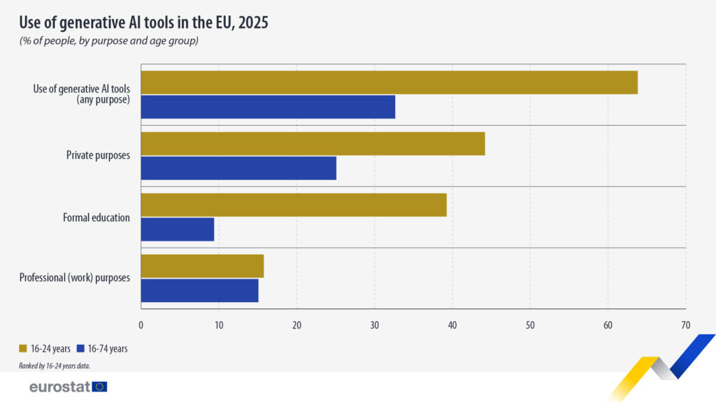 Según informa Eurostat, los jóvenes están introduciendo el uso de la IA generativa en diferentes áreas de la vida. El uso de la IA generativa para fines privados fue más común entre los jóvenes (44,2 %) que entre la población general (25,1 %). Como era de esperar, las personas en el grupo de edad más joven tenían más probabilidades de usar herramientas de IA para la educación formal (39,3 %), en comparación con el 9,4 % de la población general. Por el contrario, el uso profesional fue relativamente similar entre estos grupos de edad (15,8 % frente a 15,1 %), ya que muchos jóvenes aún no han entrado en el mercado laboral.