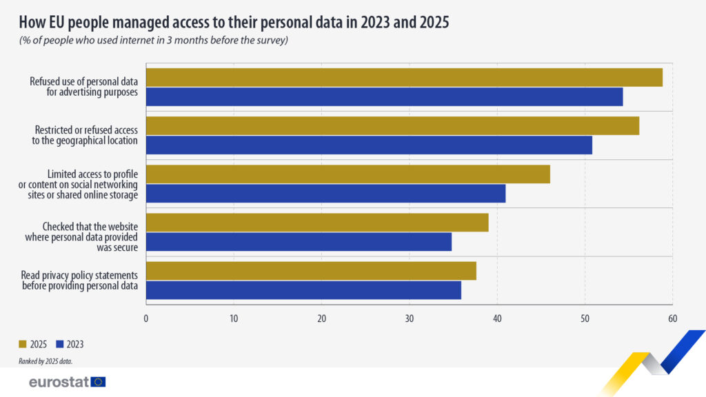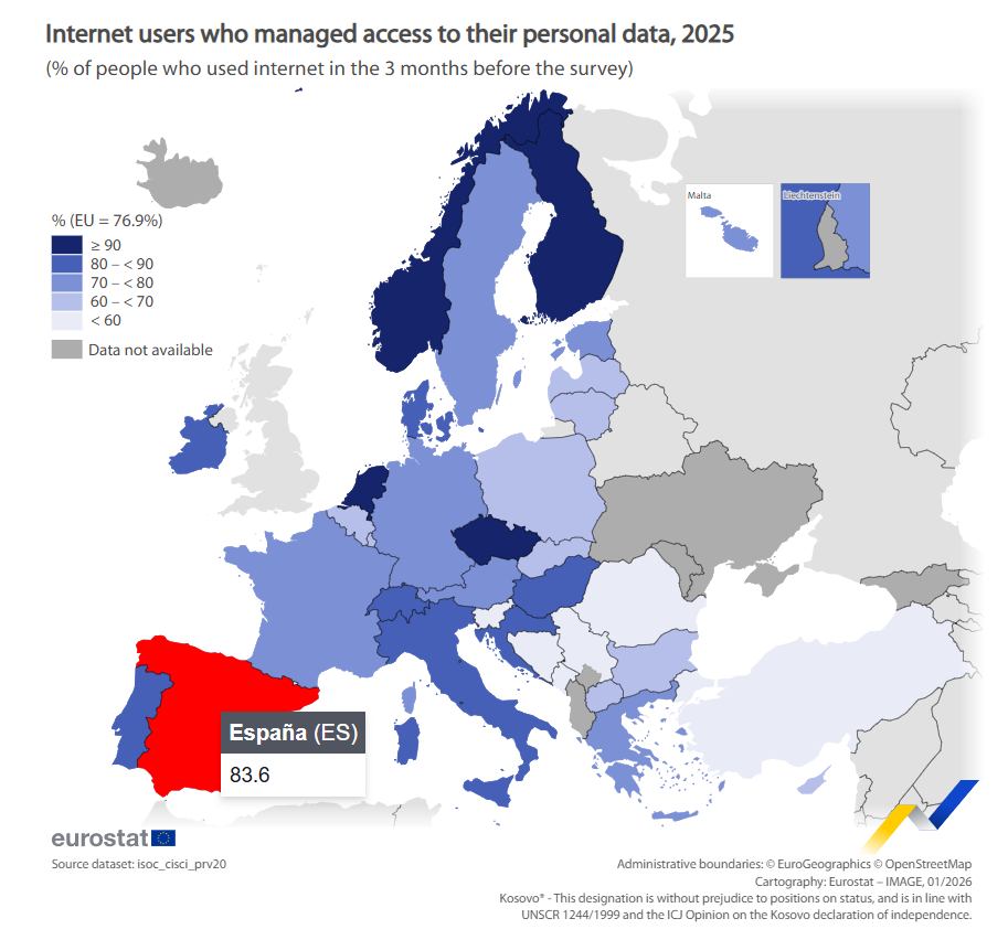 El 76,9 % de los usuarios de Internet de la UE protegieron sus datos en línea en 2025 tomando medidas para gestionar el acceso a sus datos personales, un aumento de 3,7 puntos porcentuales (pp) en comparación con 2023 (73,2 %).