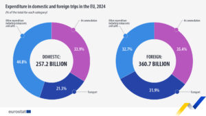 Aunque el número de viajes nacionales fue mayor, el gasto total en viajes al extranjero fue mayor. En 2024, los residentes de la UE gastaron 257.200 millones de euros en viajes nacionales y 360.700 millones de euros en viajes al extranjero.