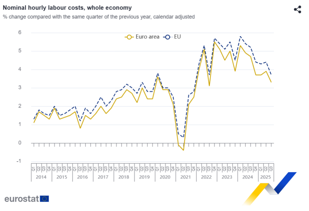 En el tercer trimestre de 2025, en comparación con el mismo trimestre del año anterior, los costes laborales por hora en la zona del euro aumentaron un 3,1 % en la economía (principalmente) no empresarial y un 3,3 % en la economía empresarial: