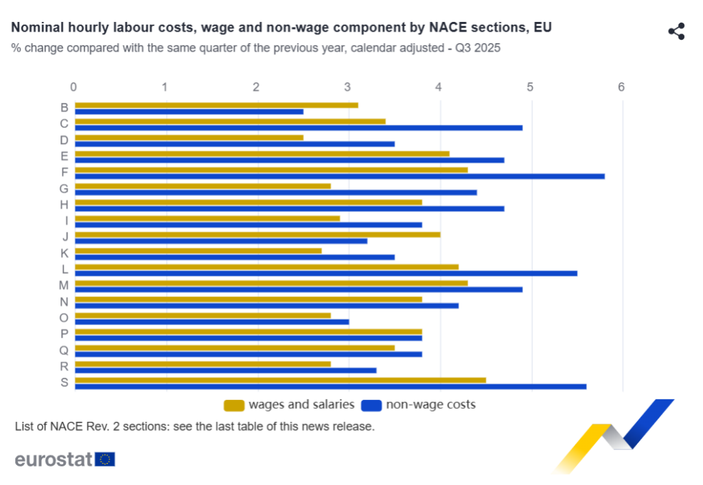 En la UE, en el tercer trimestre de 2025 en comparación con el mismo trimestre del año anterior, las actividades económicas (secciones de la NACE Rev. 2) que registraron los mayores aumentos en el componente no salarial fueron: