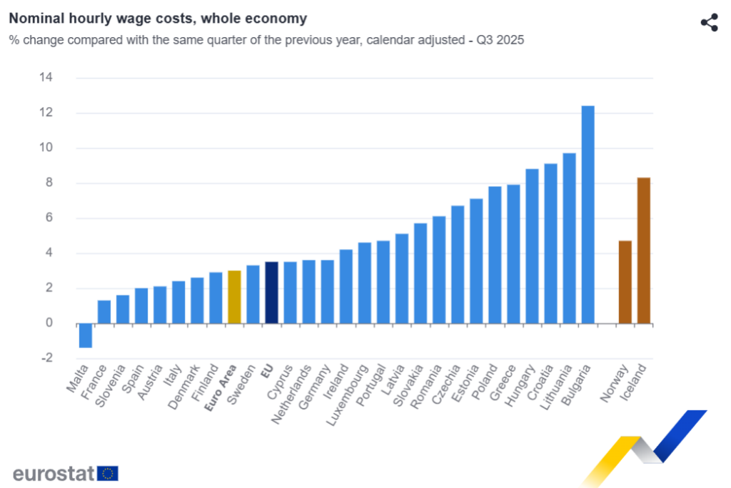 En el tercer trimestre de 2025, en comparación con el mismo trimestre del año anterior, los mayores aumentos en los costes salariales por hora para el conjunto de la economía se registraron en Bulgaria (+12,4 %), Lituania (+9,7 %), Croacia (+9,1 %) y Hungría (+8,8 %). Los menores aumentos se registraron en Francia (+1,3 %), Eslovenia (+1,6 %), España (+2,0 %), Austria (+2,1 %) e Italia (+2,4 %), mientras que Malta registró una disminución del -1,4 %.