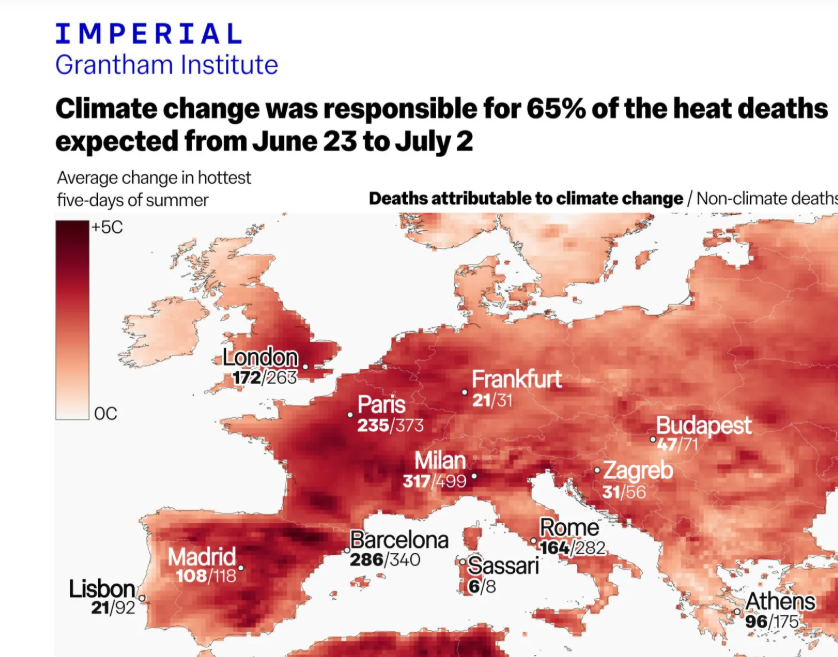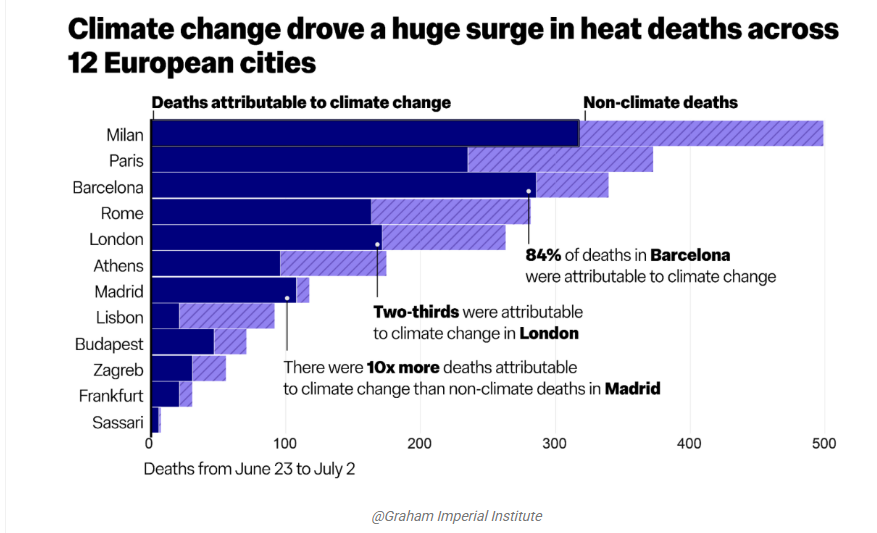 El exceso de calor asociado al cambio climático se cobró 317 vidas en Milán, 286 en Barcelona, 235 en París, 171 en Londres, 164 en Roma, 108 en Madrid, 96 en Atenas, 47 en Budapest, 31 en Zagreb, 21 en Frankfurt, 21 en Lisboa y 6 en Sassari, según el informe, en el que también ha participado investigadores de las universidad de Berna y Copehnague y del Real Instituto Meteorológico de Países Bajos.