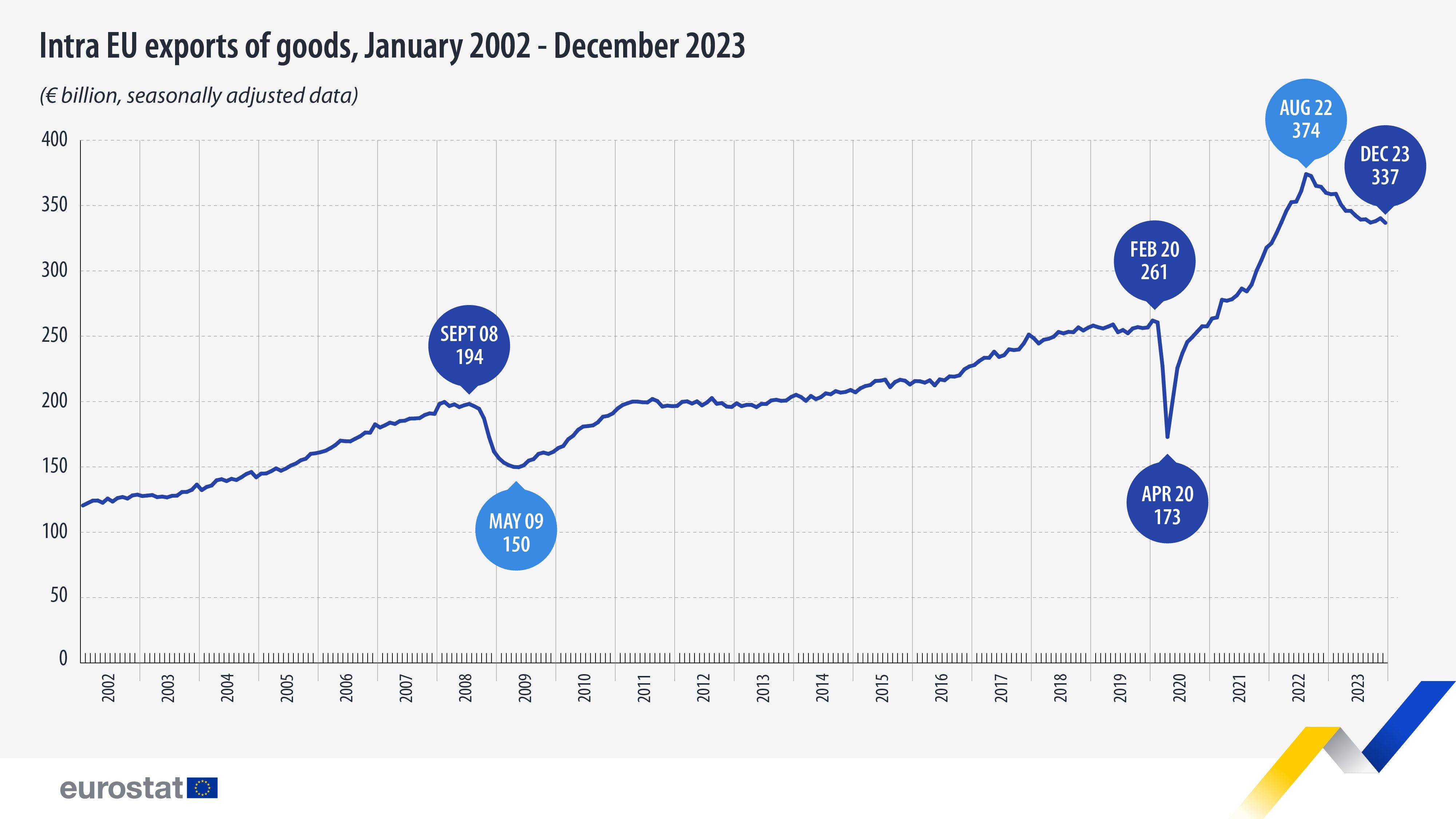 En particular, durante la crisis pandémica, las exportaciones cayeron drásticamente entre febrero de 2020 y abril de 2020, antes de recuperarse en los meses siguientes y alcanzar un máximo en agosto de 2022. A partir de septiembre de 2022, las exportaciones de bienes dentro de la UE comenzaron a disminuir gradualmente, situándose en 337 mil millones de euros en diciembre de 2023.