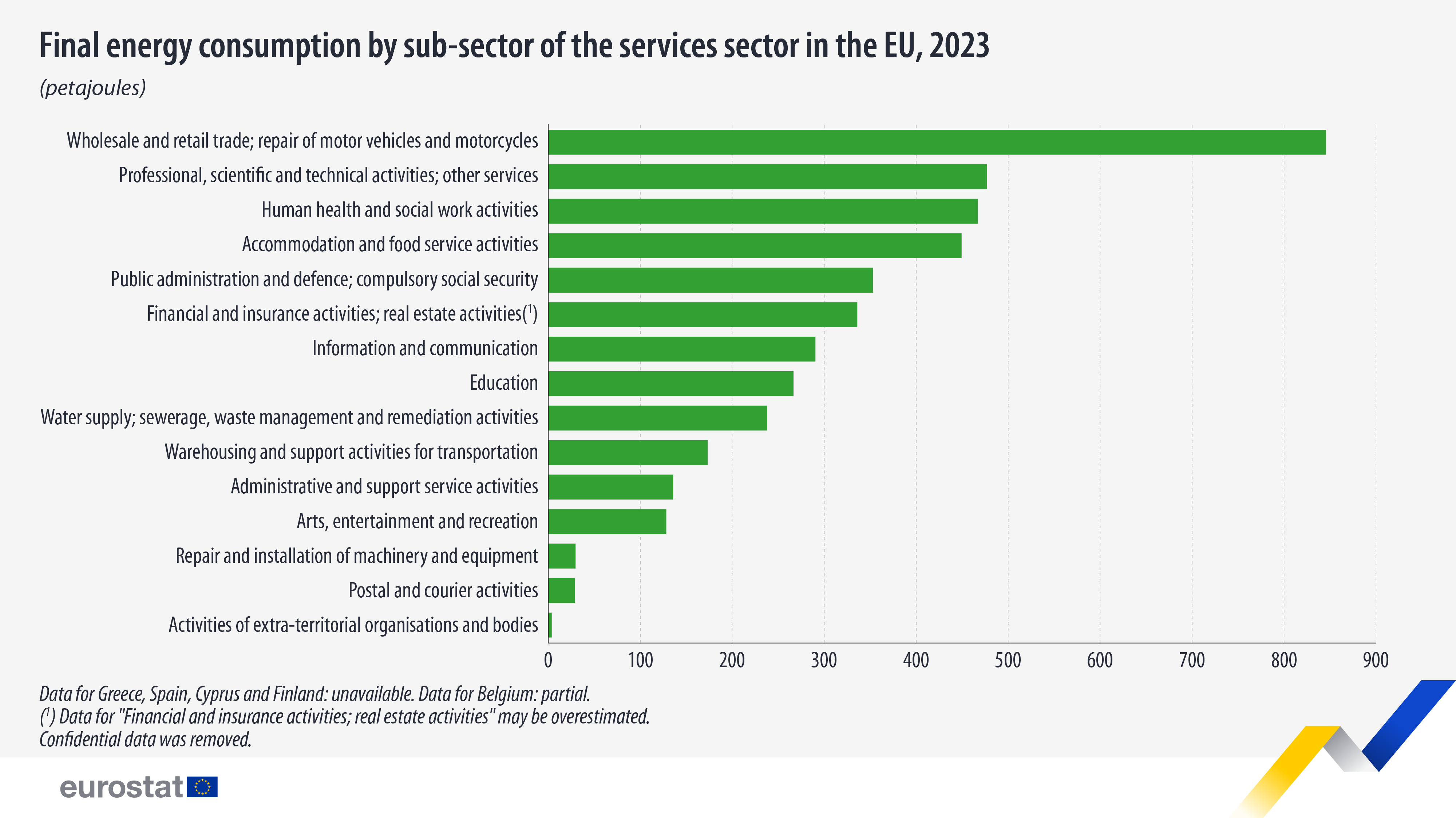 En 2023, el mayor subsector de servicios en la UE fue el comercio mayorista y minorista, con un consumo final de energía de 847 PJ, lo que representa el 20,0 % del consumo final total de servicios. La actividad del comercio minorista por sí sola representó 538 PJ en este subsector.