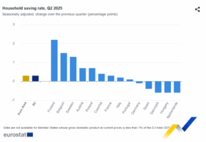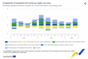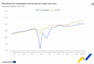 En el segundo trimestre de 2025, el consumo real per cápita de los hogares aumentó un 0,3 % en la zona del euro, tras un descenso del 0,1 % en el trimestre anterior. En el mismo período, la renta real per cápita de los hogares aumentó un 0,5 %, tras un aumento del 0,1 % en el primer trimestre de 2025.