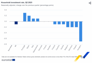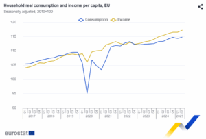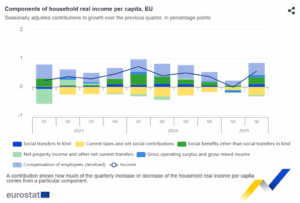 En el conjunto de la UE, el consumo real per cápita de los hogares aumentó un 0,4 % en el segundo trimestre de 2025, tras una disminución del 0,3 % en el trimestre anterior. Al mismo tiempo, la renta real per cápita de los hogares aumentó un 0,6 %, tras haberse mantenido estable en el primer trimestre de 2025.