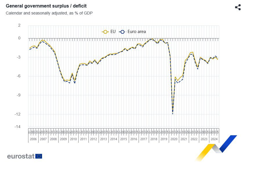 En el cuarto trimestre de 2024, la relación déficit de las administraciones públicas ajustada estacionalmente y PIB se situó en el 3,2% en la zona euro y del 3,4% en la UE, según informa Eurostat.