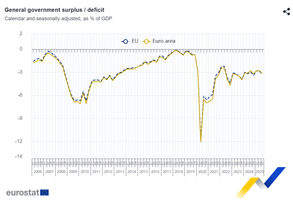 La ratio de déficit sobre el PIB de la zona del euro aumentó en comparación con el 2,8 % del segundo trimestre de 2025, mientras que la ratio de déficit sobre el PIB de la UE aumentó en comparación con el 2,9 % del trimestre anterior. Estos datos los publica Eurostat, la oficina estadística de la Unión Europea.