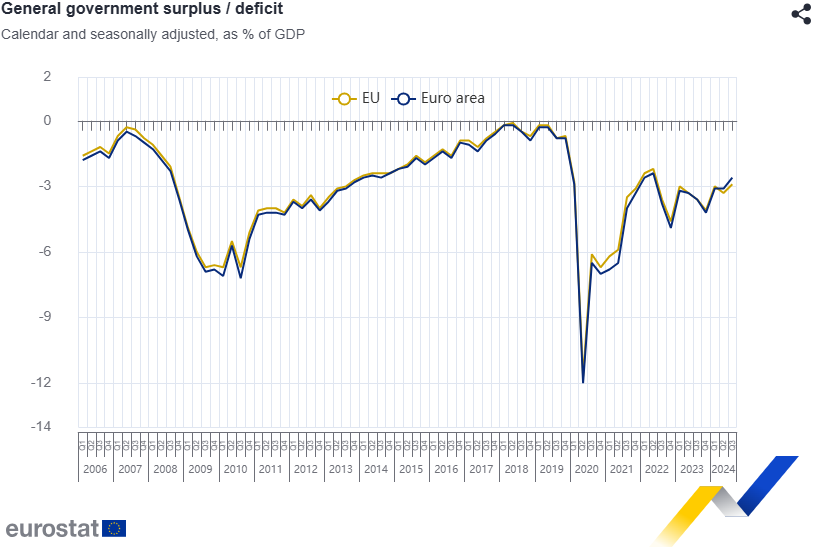 Los déficits de la eurozona y la UE disminuyen en comparación con el segundo trimestre de 2024, según informa Eurostat.