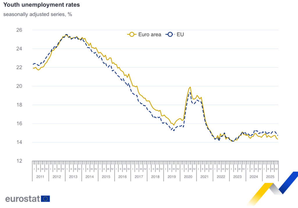 En diciembre de 2025, 2.857 millones de jóvenes (menores de 25 años) estaban desempleados en la UE, de los cuales 2.257 millones se encontraban en la zona del euro. En diciembre de 2025, la tasa de desempleo juvenil era del 14,7 % en la UE, frente al 14,9 % del mes anterior, y del 14,3 % en la zona del euro, también frente al 14,4 % de noviembre de 2025.