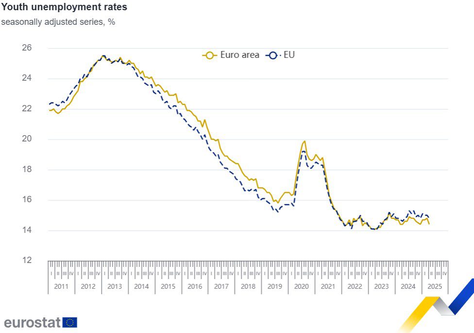 La tasa de desempleo juvenil de abril fue del 14,8 % en la UE, frente al 15,0 % de marzo de 2025, y del 14,4 % en la zona euro, frente al 14,8 % del mes anterior.