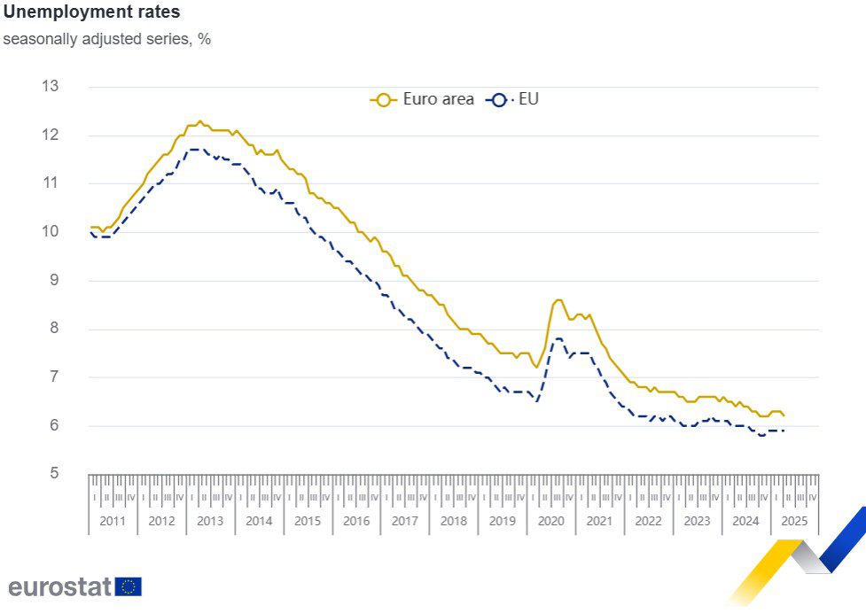 La tasa de desempleo ajustada estacionalmente de la zona euro en abril de 2025 fue del 6,2%, inferior al 6,3% de marzo de 2025 y al 6,4% de abril de 2024. La tasa de desempleo de la UE fue del 5,9% en abril, estable en comparación con marzo de 2025 e inferior al 6,0% de abril de 2024.