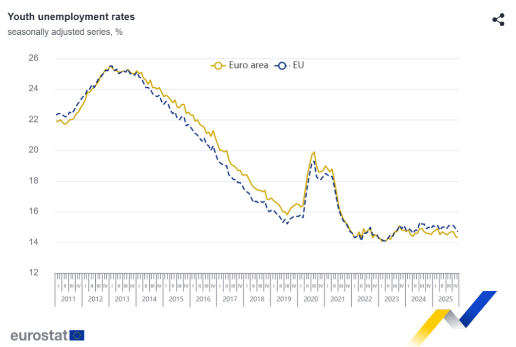 En diciembre de 2025, 2,857 millones de jóvenes (menores de 25 años) estaban desempleados en la UE, de los cuales 2,257 millones se encontraban en la zona euro. En diciembre de 2025, la tasa de desempleo juvenil fue del 14,7 % en la UE, inferior al 14,9 % del mes anterior, y del 14,3 % en la zona euro, también inferior al 14,4 % de noviembre de 2025.