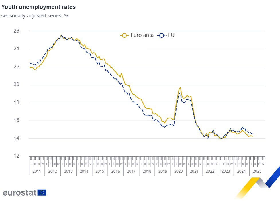 En marzo de 2025, 2,8 millones de jóvenes (menores de 25 años) estaban desempleados en la UE, 2,2 de ellos en la zona euro. En este mes la tasa de desempleo juvenil fue del 14,5% en la UE, frente al 14,6% de febrero de 2025, y del 14,2% en la zona euro, en comparación al 14,3% del mes anterior.