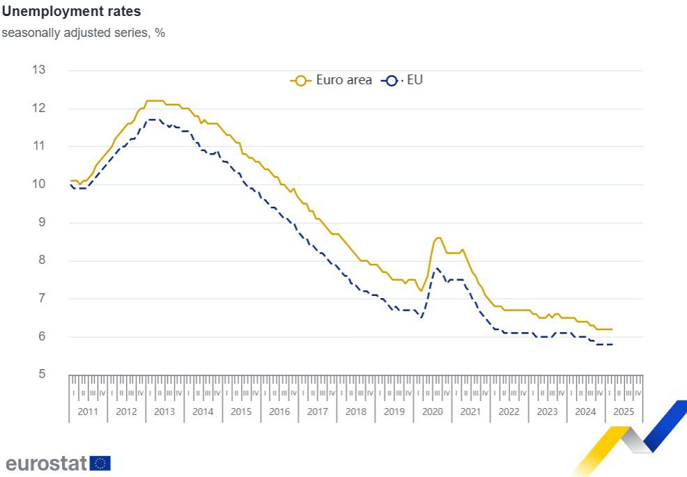 En marzo de 2025, la tasa de desempleo ajustada estacionalmente de la zona del euro fue del 6,2%, estable en comparación con febrero de 2025 y menor que el 6,5% de marzo de 2024. La tasa de desempleo de la UE fue del 5,8% en marzo de 2025, también estable en comparación con febrero de 2025 y menor que el 6,0% de marzo de 2024, según Eurostat.