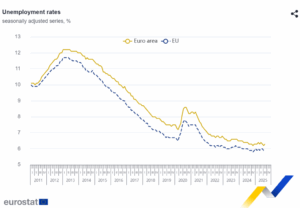 En agosto de 2025, la tasa de desempleo ajustada estacionalmente de la zona del euro fue del 6,3 %, frente al 6,2 % de julio de 2025 y estable en comparación con agosto de 2024. La tasa de desempleo de la UE fue del 5,9 % en agosto de 2025, estable en comparación con julio de 2025 y con agosto de 2024. Estas cifras las publica Eurostat, la oficina estadística de la Unión Europea .
