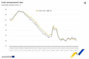En agosto de 2025, 2.819 millones de jóvenes (menores de 25 años) estaban desempleados en la UE, de los cuales 2.220 millones se encontraban en la zona euro. En agosto de 2025, la tasa de desempleo juvenil fue del 14,6 % en la UE, frente al 14,4 % de julio de 2025, y del 14,0 % en la zona euro, estable respecto al mes anterior.