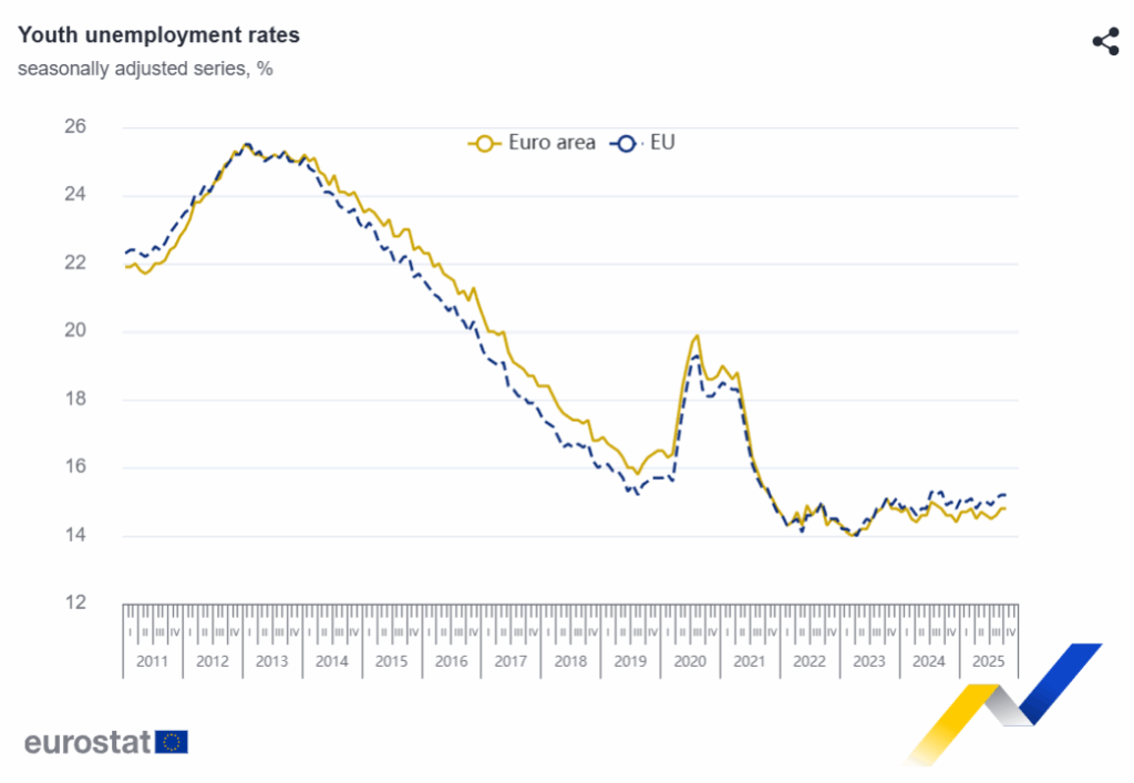 En octubre de 2025, 2.960 millones de jóvenes (menores de 25 años) estaban desempleados en la UE, de los cuales 2.352 millones se encontraban en la zona euro. En octubre de 2025, la tasa de desempleo juvenil se situó en el 15,2 % en la UE y en el 14,8 % en la zona euro, ambas estables con respecto a septiembre de 2025.