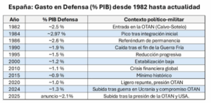 1982–1990 (entrada y Guerra Fría final): El gasto está entre 2.5 % y 2.9 % del PIB en un contexto de compromiso con la OTAN, aunque con límites (sin entrar en estructura militar), y alta inversión en modernización de las Fuerzas Armadas.