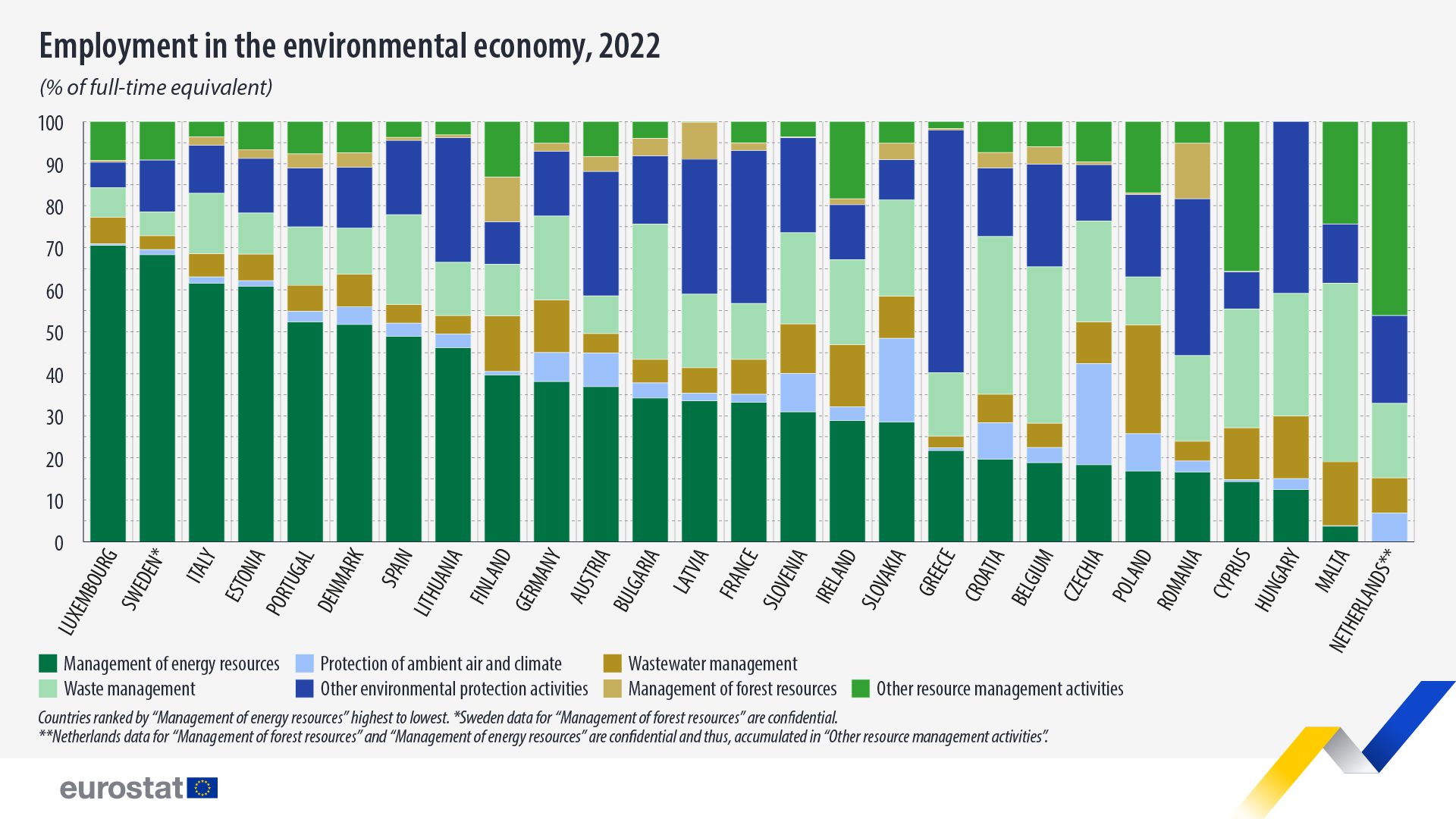 En los países de la UE, la mayor parte del empleo en la economía medioambiental está relacionado con la gestión de los recursos energéticos (un 34,8 % de media). Sin embargo, la proporción varía considerablemente entre países. La más alta se registra en Luxemburgo (70,5 %), seguido de Suecia (68,3 %) e Italia (61,5 %). Por el contrario, Malta registra el 3,7 %, Hungría el 12,7 % y Chipre el 14,3 % del empleo en esta parte de la economía medioambiental.