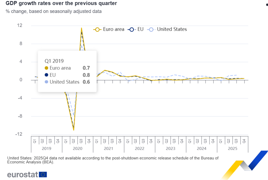 En el cuarto trimestre de 2025, el PIB desestacionalizado aumentó un 0,3 % tanto en la eurozona como en la UE, en comparación con el trimestre anterior, según una estimación preliminar publicada por Eurostat, la oficina estadística de la Unión Europea.