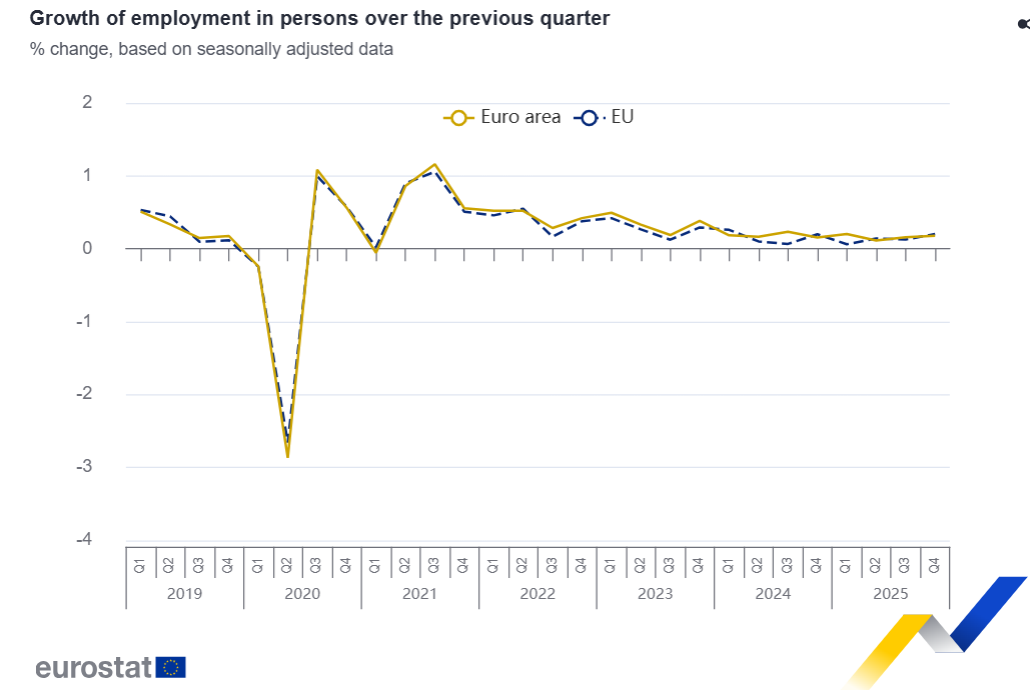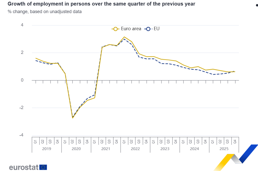 En comparación con el mismo trimestre del año anterior, el empleo aumentó un 0,6% en la zona del euro y un 0,7% en la UE en el cuarto trimestre de 2025, después del +0,6% en la zona del euro y el +0,5% en la UE en el tercer trimestre de 2025.