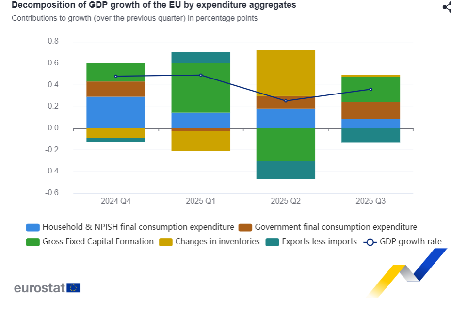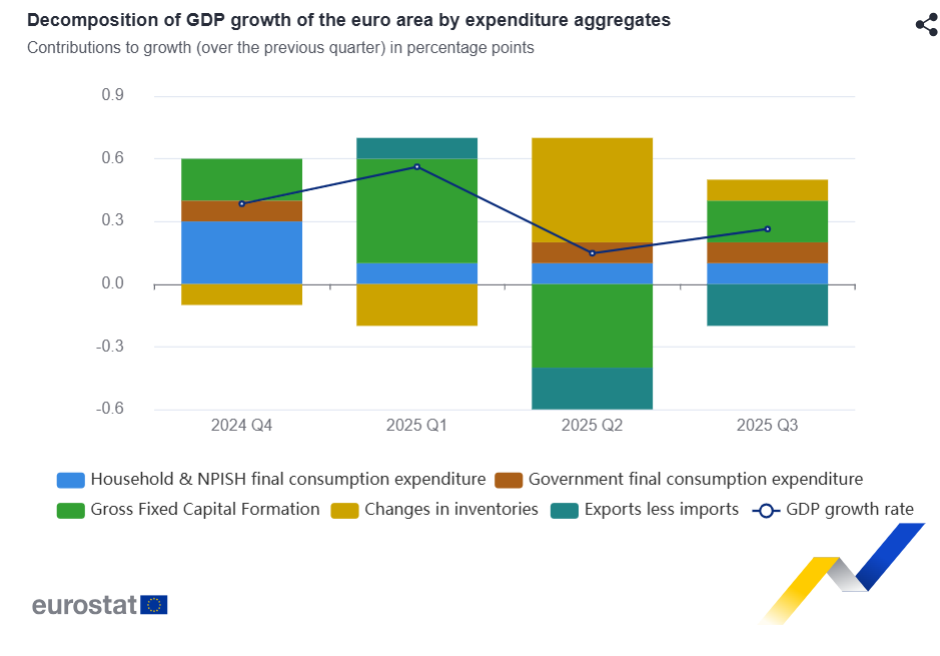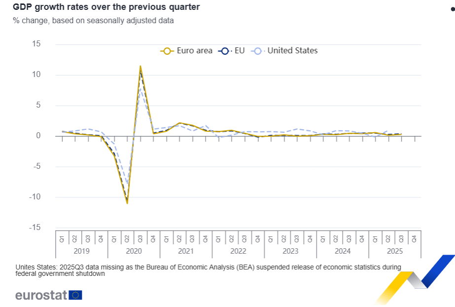 El PIB desestacionalizado aumentó un 0,3 % en la eurozona y un 0,4 % en la UE en el tercer trimestre de 2025, en comparación con el trimestre anterior, según una estimación publicada por Eurostat, la oficina estadística de la Unión Europea .