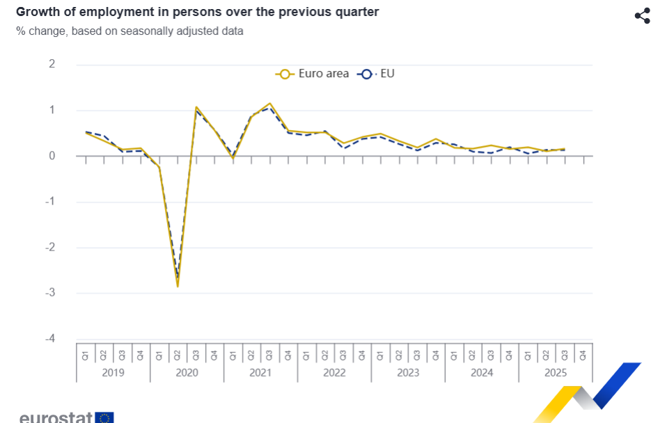 En comparación con el mismo trimestre del año anterior, el empleo aumentó un 0,6% en la zona del euro y un 0,5% en la UE en el tercer trimestre de 2025, después del +0,7% en la zona del euro y el +0,5% en la UE en el segundo trimestre de 2025.