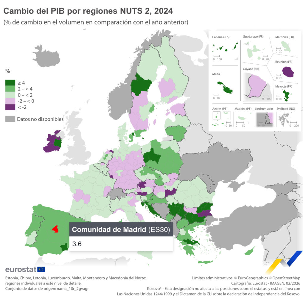 El PIB real aumentó en 169 regiones de la UE en 2024 en comparación con 2023, mientras que se registraron disminuciones en 64 regiones.
