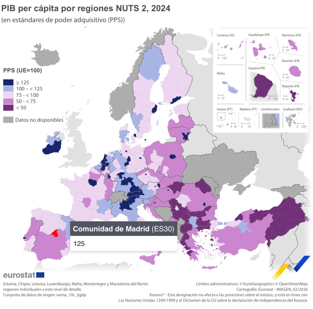 Por el contrario, además de Mayotte (30,1 % del promedio de la UE), las regiones con la clasificación más baja del PIB regional per cápita en 2024 incluyeron Guyana, otra región francesa (40,8 %), Severozapaden en Bulgaria (41,7 %), Voreio Aigaio en Grecia (42,1 %) y Severen Tsentralen también en Bulgaria (43,3 %).