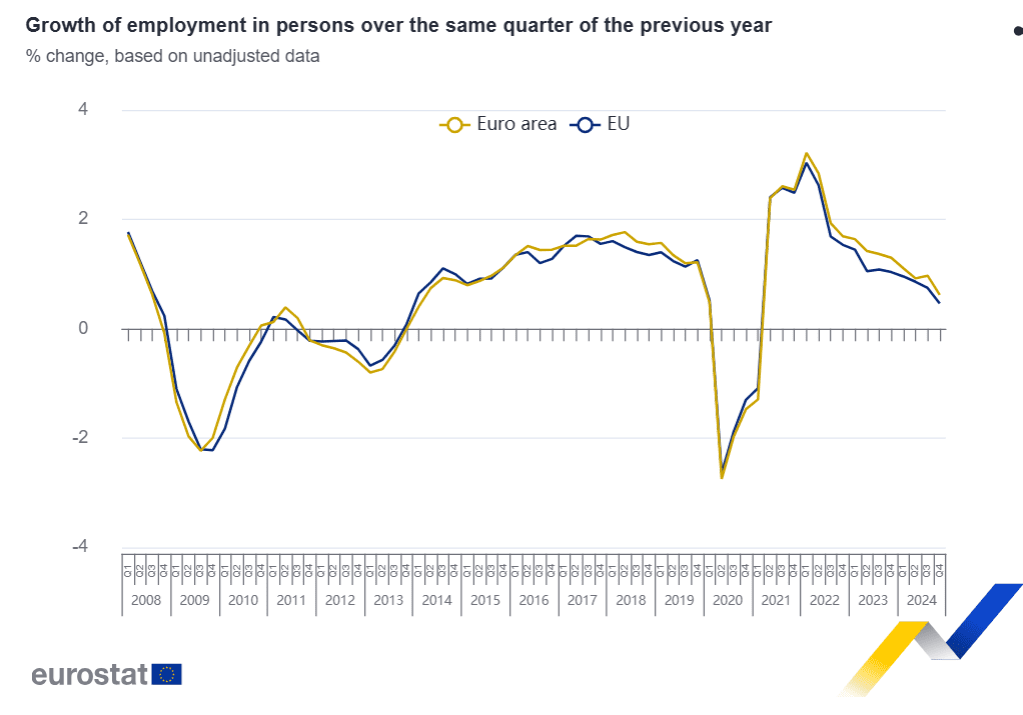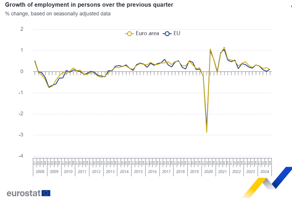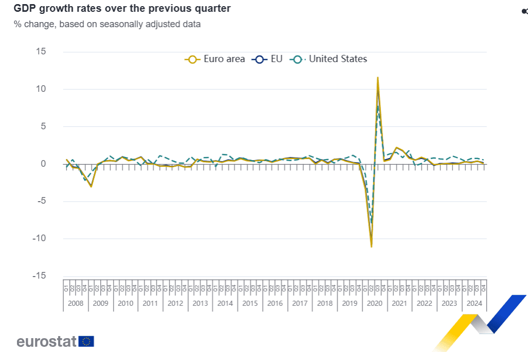 El PIB desestacionalizado aumentó un 0,1% en la zona del euro y un 0,2% en la UE en el cuarto trimestre de 2024, en comparación con el trimestre anterior, según una estimación preliminar publicada por Eurostat, la oficina estadística de la Unión Europea. En el tercer trimestre de 2024, el PIB había crecido un 0,4% en ambas áreas.