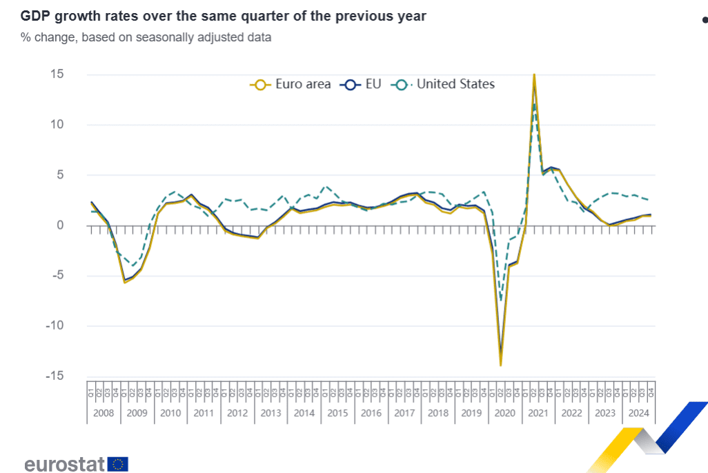 En comparación con el mismo trimestre del año anterior, el PIB desestacionalizado aumentó un 0,9% en la zona del euro y un 1,1% en la UE en el cuarto trimestre de 2024, tras el +0,9% en la zona del euro y el +1,0% en la UE en el trimestre anterior.