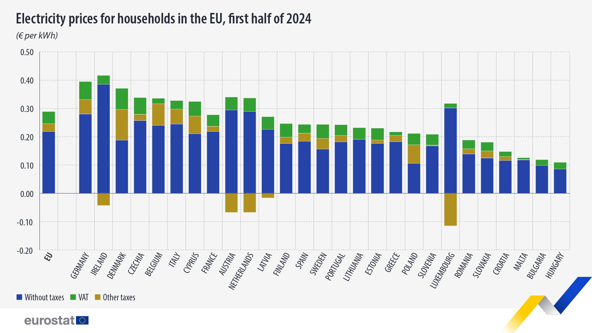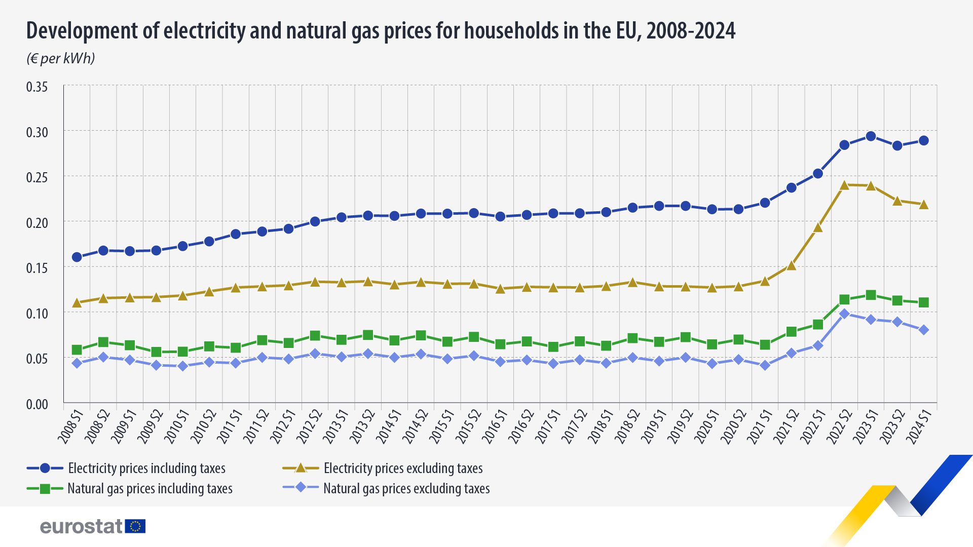 Según los datos de Eurostat, a pesar de las reducciones en el coste de la energía, el suministro y los servicios de red (-2% en comparación con el segundo semestre de 2023), los precios totales aumentaron ligeramente (+2%), a medida que los gobiernos redujeron las subvenciones, las desgravaciones y los impuestos para los consumidores. En comparación con la primera mitad de 2023 (29,4 por 100 kWh), los precios registraron un pequeño descenso.
