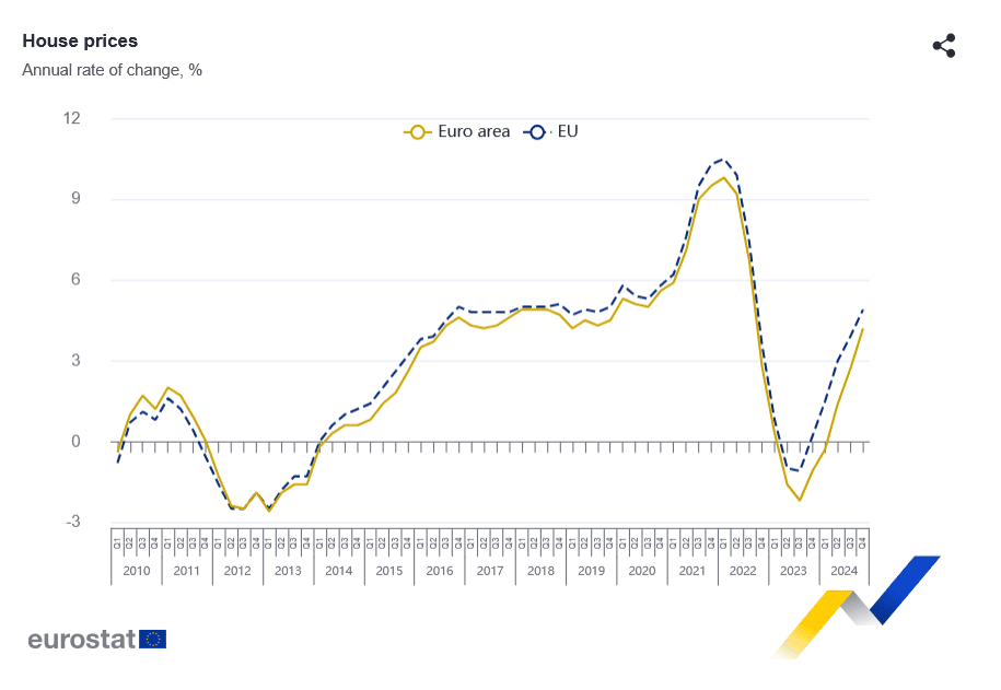 En el cuarto trimestre de 2024, los precios de la vivienda, medidos por el índice de precios de la vivienda, aumentaron un 4,2% en la zona euro y un 4,9% en la UE en comparación con el mismo trimestre del año anterior, según informa Eurostat.