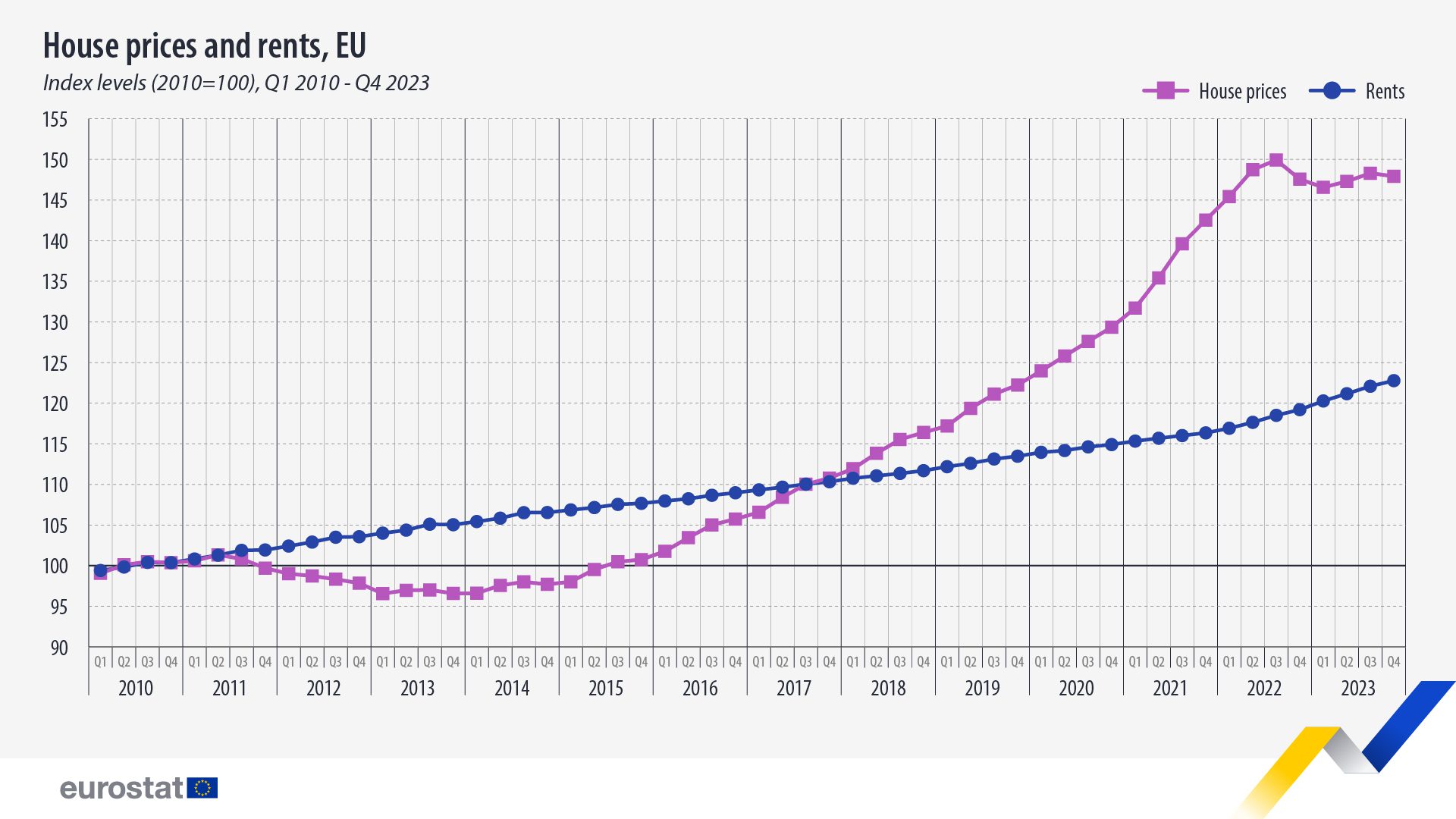 Entre 2010 y el cuarto trimestre de 2023, los precios de los alquileres aumentaron un 23% en la UE. Los alquileres aumentaron en 26 países de la UE con las mayores subidas en Estonia (207%), Lituania (172%) e Irlanda (102%). La única disminución de los precios de los alquileres se registró en Grecia (-19%).