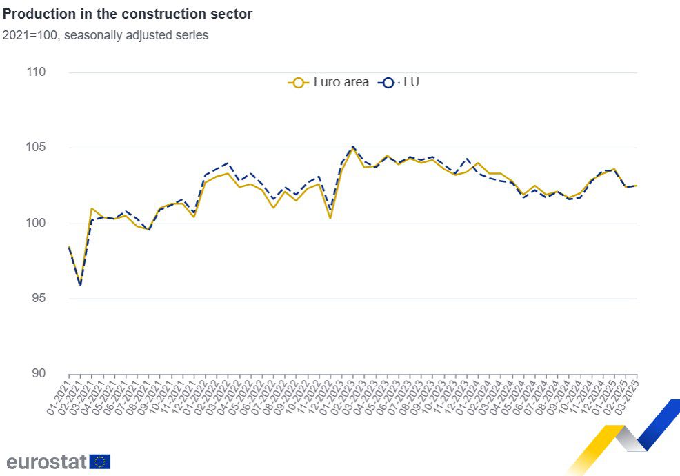 En marzo de 2025, en comparación con febrero de 2025, la producción desestacionalizada en la construcción aumentó un 0,1 % tanto en la zona euro como en la UE. La construcción de edificios y la ingeniería civil fueron algunos de los ámbitos en los que más creció el sector, según las estimaciones de Eurostat.